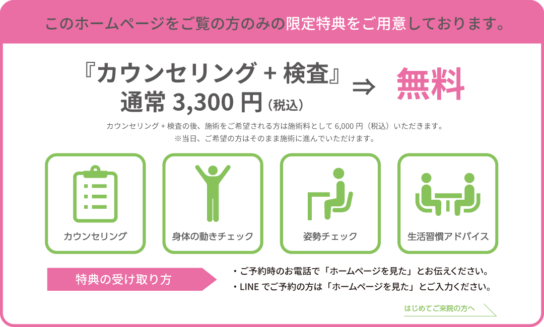 また、妊娠中で腰痛でお悩みの方も当院にお任せください。まずはその痛みの原因をはっきりとさせ、根本的な改善と生活習慣の改善で、今の痛みはもちろん、これから先の痛みからも解放いたします。